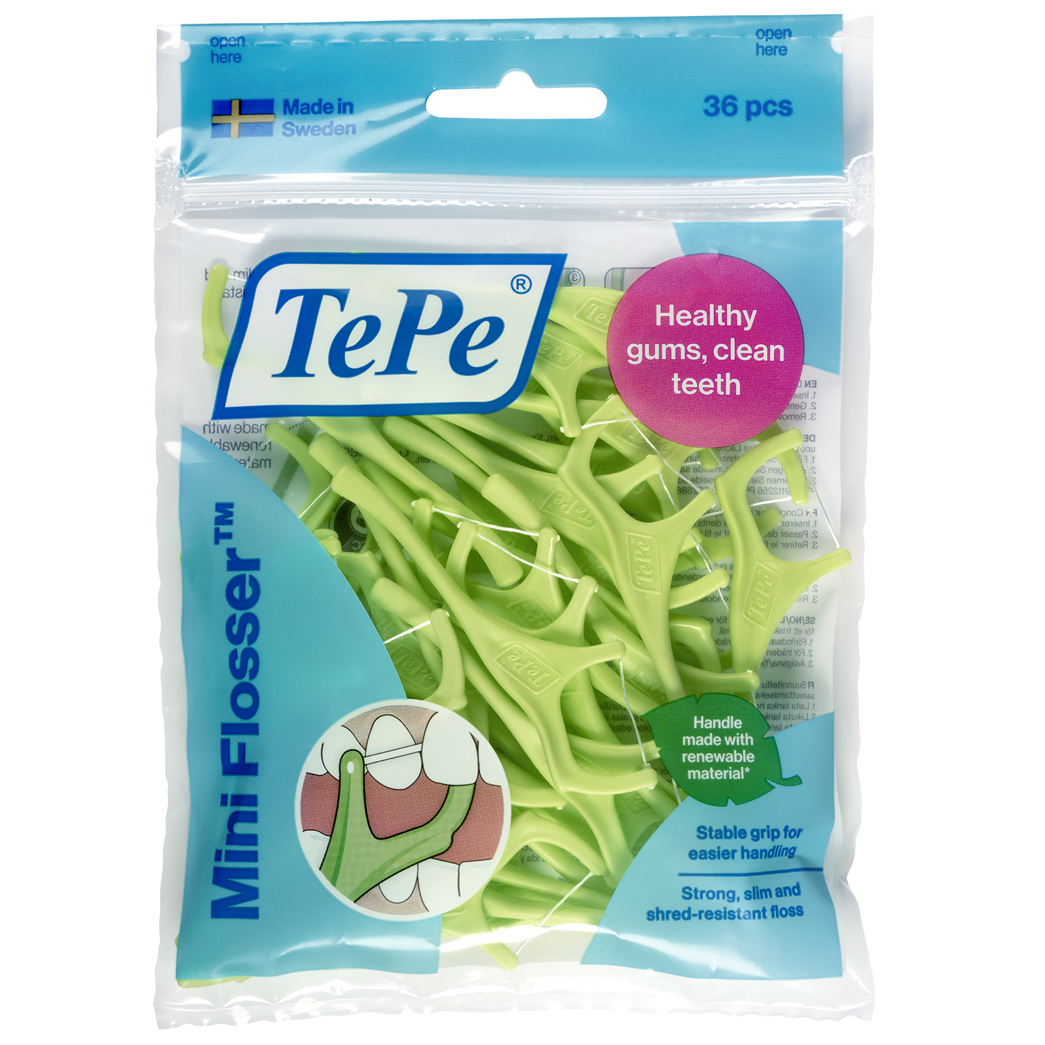 TePe GOOD Mini Flosser™ is a pre-loaded floss holder for efficient and convenient use. It contains strong, PFAA free floss which glides easily through narrow interdental spaces. The cleverly designed bite plain helps to gently insert the floss. The slender handle fits comfortably in the hand. An excellent cleaning aid for tight spaces between the teeth – use daily to keep gums and teeth healthy and fresh. Thanks to the use of renewable raw materials in the handle – sugar cane and wood fibres – we manage to recirculate 85 % of the carbon dioxide emissions during the products life cycle. All TePe products are produced with green energy from renewable sources. The GOOD Mini Flosser comes in a bag made from sugarcane.