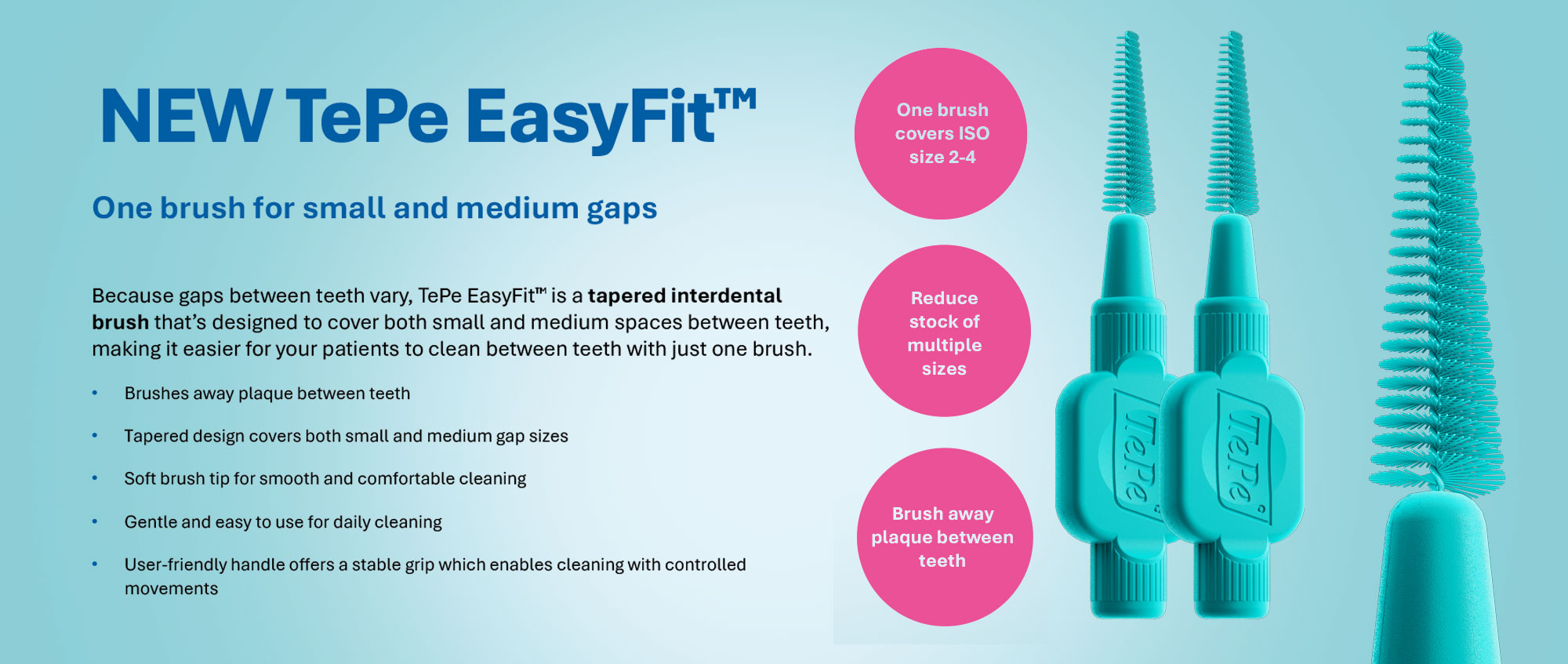 Because gaps between teeth vary, TePe EasyFit is a tapered interdental brush that’s designed to cover both small and medium spaces between teeth, making it easier for your patients to clean between teeth with just one brush.